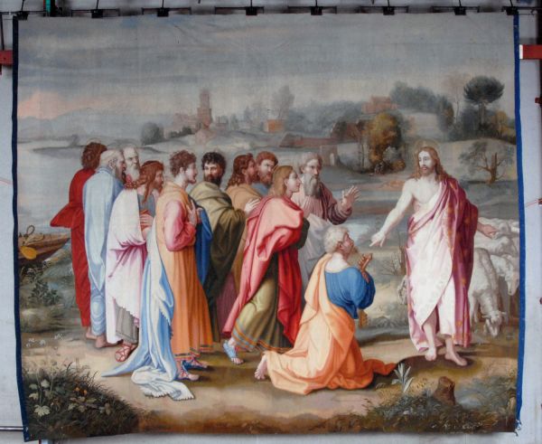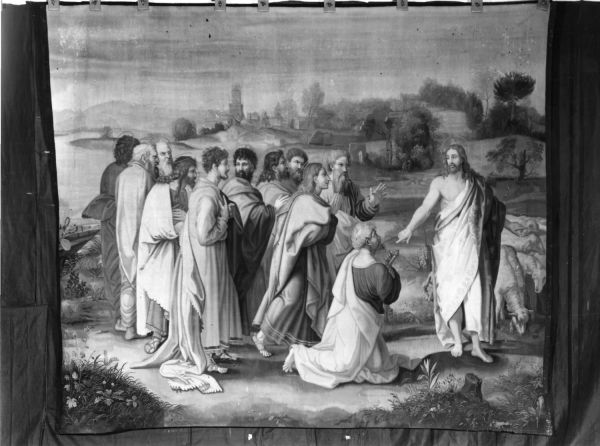 Le Christ (devant un troupeau de brebis) remet une clef à saint Pierre en présence des 11 autres disciples, sur paysage montagneux, agrémenté d'un village, barque et étendue d'eau