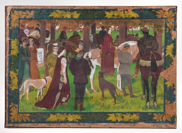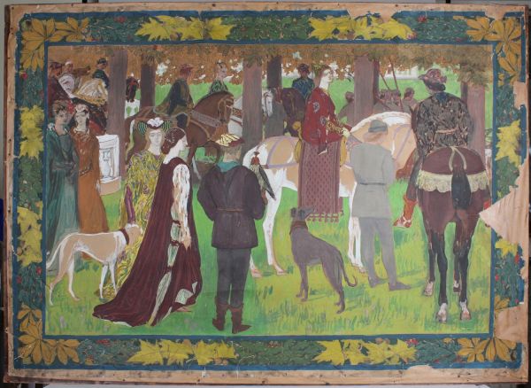 Sur un fond de prairie verte se détachent les chasseurs en position de départ, les femmes les regardant. les personnages sont en costumes médiévaux.