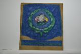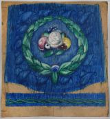 Sur un fond bleu se détachent des fleurs dans une couronne de laurier. Plate-bande : sur un fond bleu se détachent des feuillages verts entrelacés.