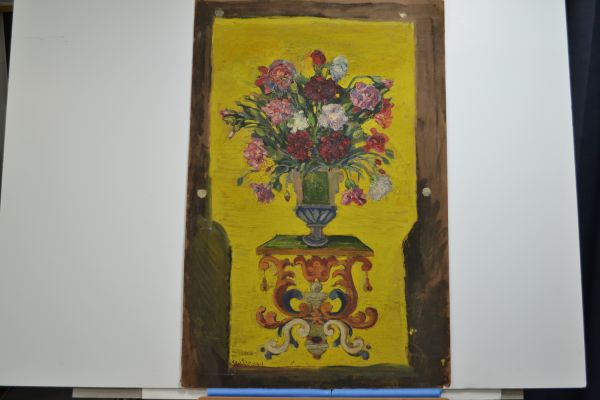Peinture sur carton. Sur un fond jaune se détache un vase de fleurs posé sur une table soutenue par une console.