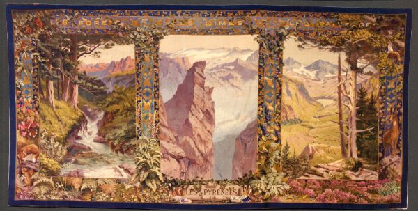 La composition est divisée en trois parties représentant chacune un paysage montagneux dont le titre est indiqué dans la bordure supérieure : "Les Forêts", "Les Cimes", "Les Pâturages". Dans un cartouche de la bordure inférieure: "Les Pyrénées".