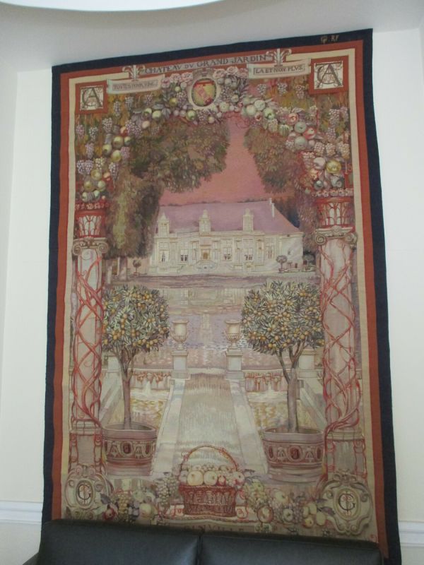 Vue prise d'une terrasse au bord du bassin, dans l'axe du château - Deux pilastres encadrent, surmontés de fruits se rejoignant au centre - Listels crème rouge et bleu - Inscriptions : "Château du Grand jardin" "Toutes pour une" "La et non plus" "Joinville" - Monogramme : de la Compagnie des Arts Français aux coins supérieurs - (GJ)