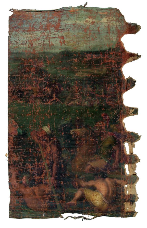 Le carton servit au tissage d’une tapisserie de basse lisse, la composition étant inversée par rapport au tableau original (Paris, musée du Louvre, INV.2894). Le présent lé correspond à l'aile gauche de la tapisserie. Un soldat macédonien à cheval y domine cinq captifs perses, représentés dans des attitudes contrastées.