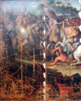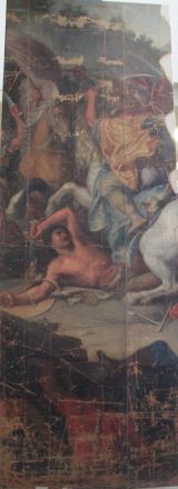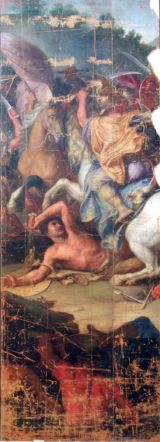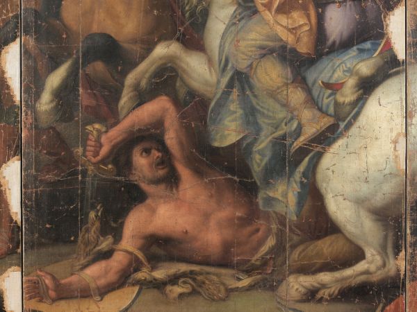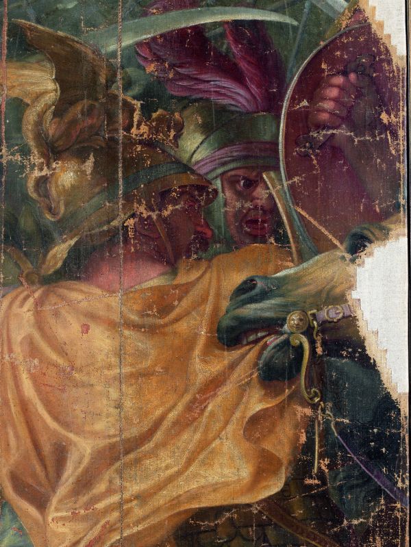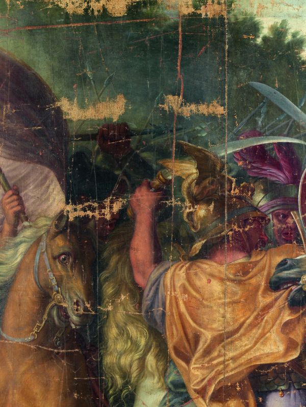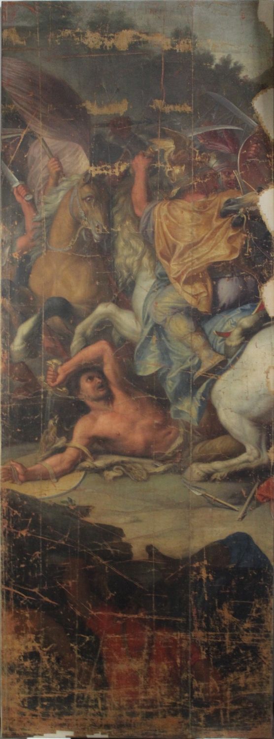 Le carton servit au tissage d’une tapisserie de basse lisse, la composition étant inversée par rapport au tableau original (Paris, musée du Louvre, INV.2894). Pour faciliter le travail des liciers, la toile fut découpée en cinq bandes. Le présent lé, qui représente un cavalier macédonien foulant un soldat perse, correspond à la partie dextre du carton.