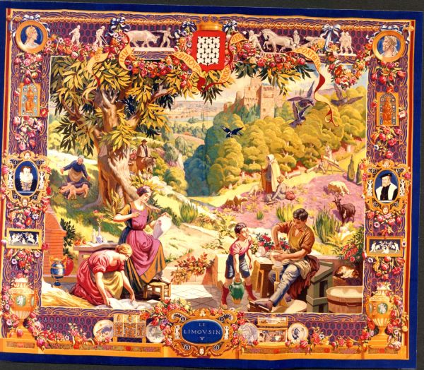 Au premier plan, sur une terrasse des ouvriers, homme et femme, travaillent à la fabrication de poteries. L'arrière-plan offre une campagne vallonnée de champs et de forêts avec un château fort et une ville dans le lointain. La large bordure est richement ornée. Au centre de la partie supérieure, se trouve le blason du Limousin. Les montants sont ornés dans leur milieu par les portraits d'une reine et d'un roi avec dans les angles des bustes de profil et des grandes vases de fleurs. Le centre de la partie inférieure a un cartouche portant l’inscription " Le Limousin"