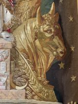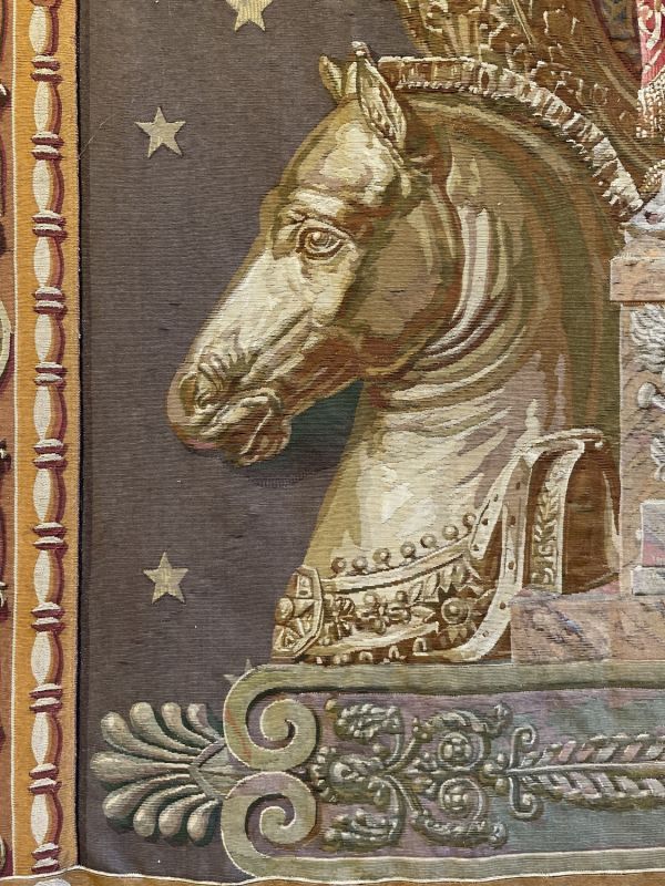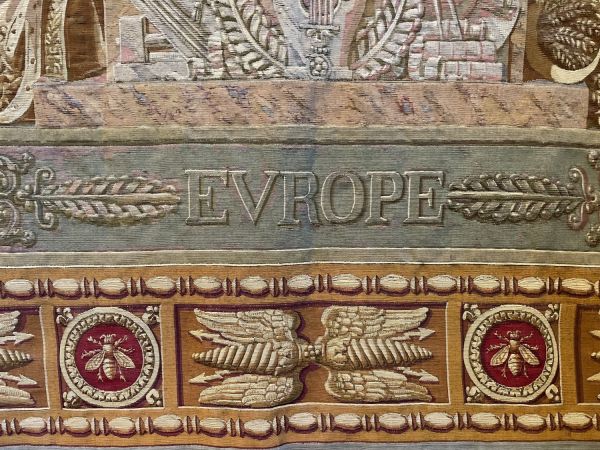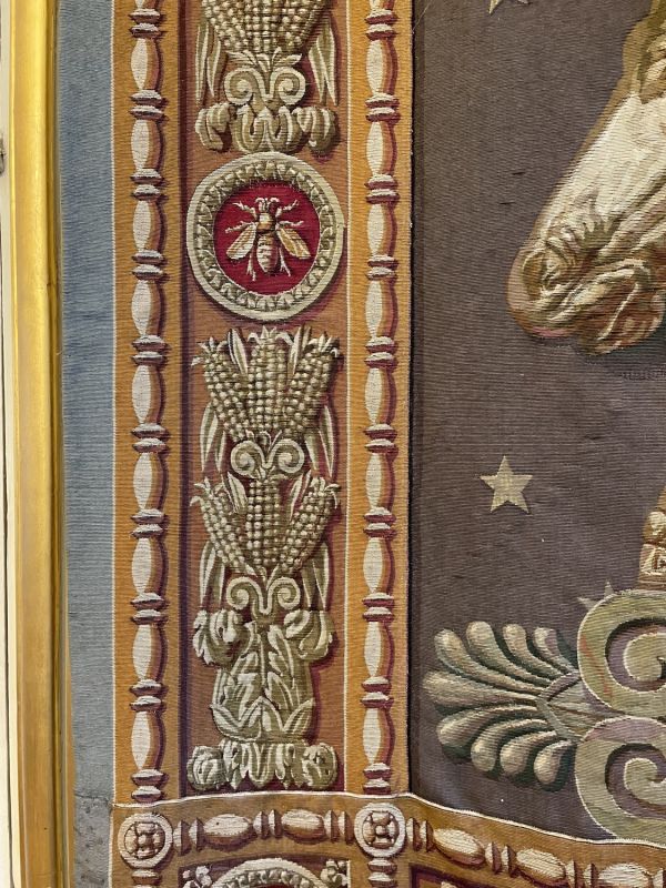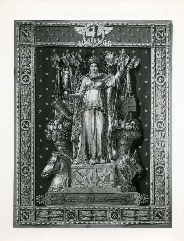 Femme drapée en manteau de cour couronnée et ayant dans la main droite une boule à Victoire ailée - de la main gauche une grande canne - monté sur un socle avec attributs se détachant sur fond de six drapeaux surmontés d'aigles, cornes d'abondance et différents attributs - tête de cheval et de boeuf carton de Europe - fond général vert avec étoiles - large bordure avec panneaux rectangulaires - en haut l'aigle dans la couronne sur un semis d'abeilles sur fond havane - aux angles N dans un cercle à fond rouge orné de chaque côté d'une frise verticale d'épis de maïs - avec les médaillons N et abeilles sur fond rouge et dans le bas les foudres alternés de médaillons dito - bordure perles et pirouettes et l'ensemble de couleur or et vieil or.