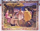 Dans un paysage bucolique, une jeune fille, assise sur la margelle d'une fontaine, vient chercher de l'eau avec sa cruche. A ses côtés, se tiennent deux jeunes pâtres vêtus à l'antique dont l'un discute avec un berger des Alpes accompagné de son chien.