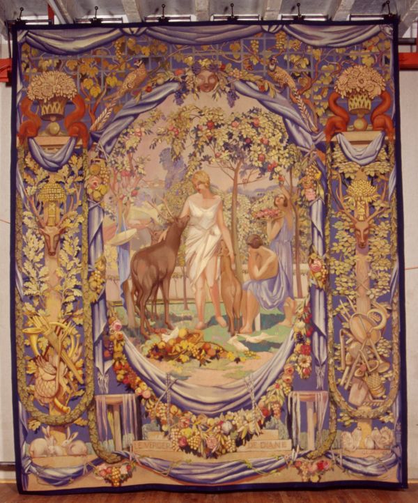 Au centre : Diane debout à côté de 2 cerfs et de 2 personnages féminins, dans un décor de verdure. Bordure formant encadrement : à la partie supérieure des feuilles de vigne et 2 oiseaux; à la partie inférieure des guirlandes de fleurs; sur les côtés une tête de cerf, des feuillages et instruments divers.
