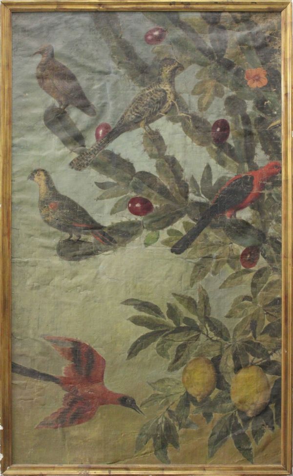 Cinq oiseaux dans un décor de cactus et de citronniers sur fond bleu.