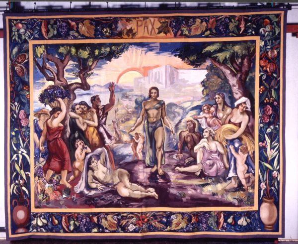Femme à moitié nue au centre, une branche d'olivier à la main symbolisant la paix, nombreux personnages au repos la regardent passer dans un décor de verdure; large bordure de fruits, à la bordure supérieure au centre le mot " PAX ".