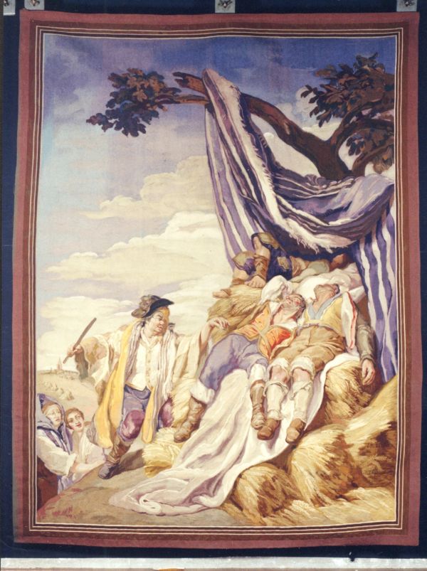 A droite, sous un grand tissu rayé accroché à arbre, trois paysans dorment sur des bottes de paille. A gauche, deux paysannes surprennent un homme, portant un chapeau, qui tente de subtiliser une pièce dans la poche d'un des dormeurs.