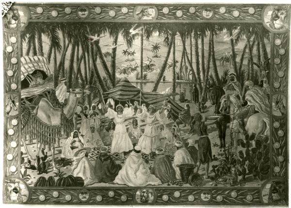 Au premier plan, un campement bédouin est installé dans une palmeraie. Au centre, deux femmes dansent sur un tapis au milieu d'hommes et de femmes assis. A gauche, un couple arrive à dos de chameau tandis qu'à droite des cavaliers partent à la chasse au faucon. A l'arrière-plan, des cavaliers galopent dans les dunes derrière l'oasis. La composition est encadrée d'une bordure ornée de médaillons avec des têtes d'animaux dont des lions dans les angles. Les médaillons sont reliés par une frise de feuilles d'oranger agrémentée d'oranges et de petits palmiers.
