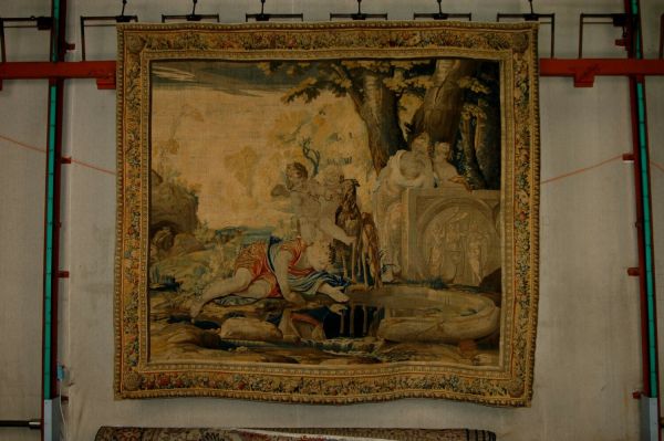 Différentes tapisseries des Scènes mythologiques appartenant à des collections privées, portent sur la. lisière les monogrammes de Charles de Cornans et de Hippolyte de Comans, directeurs de l'Atelier du Faubourg Saint-Marcel. Il est donc permis de supposer que la pièce exposée provient également de cet atelier.