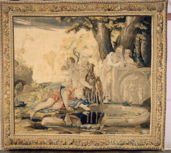 La tenture des Scènes mythologiques regroupe différentes pièces tissées dans les Ateliers parisiens dans la première moitié du XVIIe siècle. C'est à Pierre Rosenberg et à Jacques Thuillier que l'on doit: l'attribution de cette pièce - et de trois autres qui appartiennent également aux collections du Mobilier national - au peintre Laurent de La Hyre. Ces auteurs ont signalé l'existence d'une version peinte de Narcisse /signée La Hyre qui est passée en vente à Londres en 1919 (une copie figure au Musée d'Oran). Le Palais ducal de Mantoue conserve deux pièces de la même série dont une représentant aussi. Narcisse . Elles ont été successivement attribuées à Jules Romain et à Nicolas Poussin.