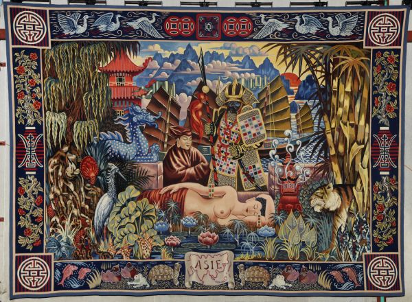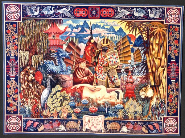 Au bord d'un bassin de nymphéas et de lotus, gardé de part et d'autre par un tigre et une grue sacrée, une figure féminine, inspirée des boughas couchés, dort au milieu des plantes tropicales. Un dragon chinois en pierre sculpté et deux figures symboliques, un bonze assis et méditant, un samouraï japonais, veillent devant une pagode et des jonques sur un fleuve. Une large bordure encadre la scène. Elle est ornée de nombreux éléments décoratifs d'Extrême-Orient: grues, de caractères chinois, canards mandarins, tortues, poissons...Au centre de la bordure inférieure, un cartouche portant la carte simplifiée de l'Asie (inscription).