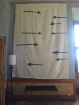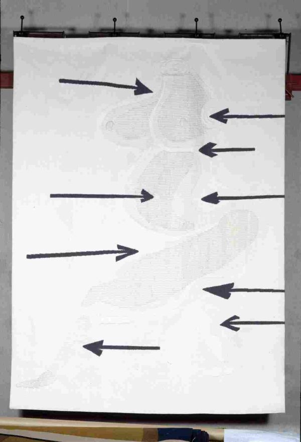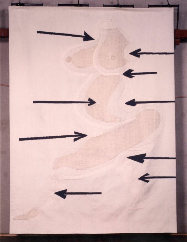 Femme sans tête, nue, de profil le corps criblé de flèches. Tapisserie monochrome ; modelé traduit par des grosseurs de tissage différentes.