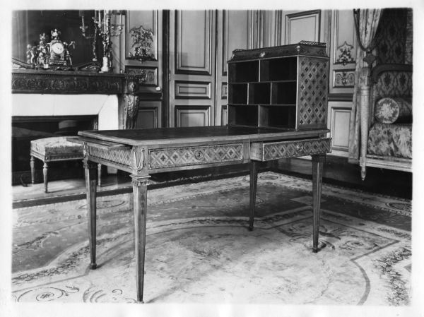 Inscrit à l'inventaire annexe du Mobilier national en février 1932, le bien étant au ministère de la Marine ("chambre Marie-Antoinette, pièce 228") (Arch. Mob. nat., inventaire annexe des meubles, n° 485).