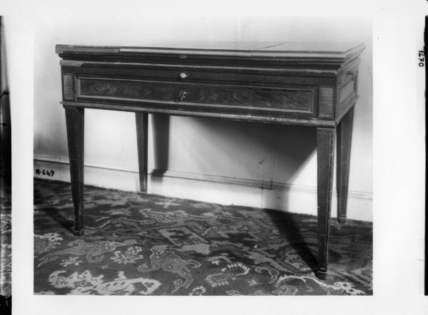 Ouvrant à un tiroir dans la ceinture ornée d'encadrement à toutes faces de filets de cuivre et d'une moulure à profil de doucine. Pieds gainés à section carrée, ornés de filets de cuivre et de sabots. Dès de raccordement de la ceinture ornés de plaques de cuivre moleté. Tables à coulisse aux extrémités. Dessus à inclinaison mobile. ornés sur le champ d'une moulure de cuivre demi-ronde, doublé d'un volet ferré à charnières à inclinaison contraitre.
