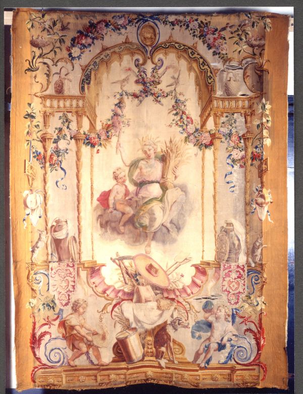 Au-dessous d’un portique, au milieu, Cérès, sur des nuages, supporte une gerbe de blé dans le bras gauche et un flambeau dans la main droite. A côté d'elle, à gauche, un enfant nu tient une faucille. Au bas de la composition, de chaque côté d'un trophée d'instruments d'agriculture, à gauche, un enfant vanne du blé, et, à droite, un enfant boit à une bouteille de terre, à côté d'un chien assis qui le regarde. Sur les consoles, à gauche , un vase de grès, une vannerie, un chat ; à droite, un autre vase et un lapin. Au-dessus des colonnettes sont posées deux bouteilles enfermées dans des paniers. En haut, guirlandes de fleurs, nids d'oiseaux et, au milieu, le signe du Lion. De chaque côté des colonnettes, une chute de divers objets avec le signe du Cancer à droite et le signe de la Vierge à gauche.