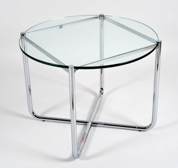 Table basse ronde. Piétement tubulaire en acier chromé formant une croix au sol, plateau circulaire en dalle de verre clair (épaisseur : 1,2 cm).