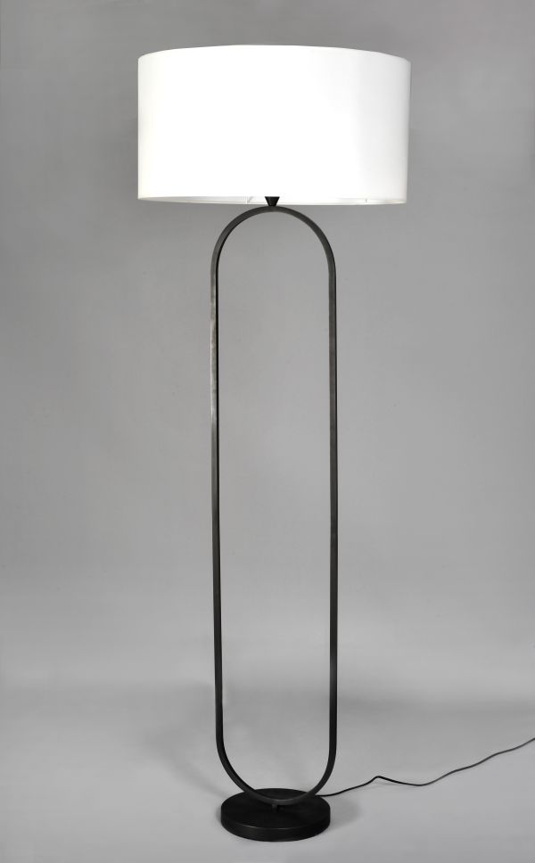 Finition noir. Lampadaire en laiton : socle rond, tige de section carrée en forme d’ovale. Abat-jour cylindrique écru (H. 0,30 x D. 0,60 m.).