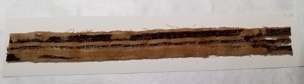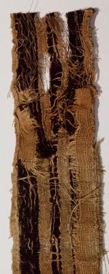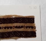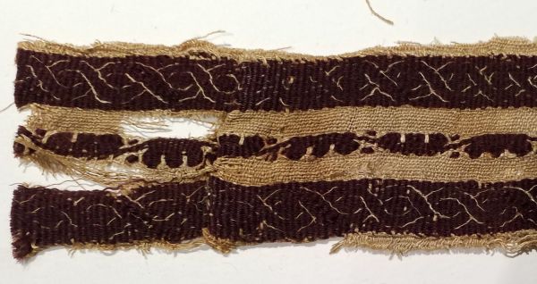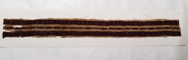 Fragment de bande décorative à décor pourpre et écru d'entrelacs séparé en trois bandes. Les motifs sont réalisés à la navette volante.