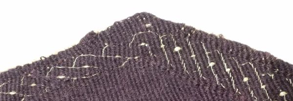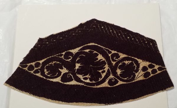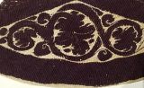 Fragment de tapisserie bichrome, pourpre foncé et écru à décor de tresse à deux brins et de rinceau de vigne inscrit dans une forme en losange. Le fragment est cousu au fil de soie sur un support en toile.