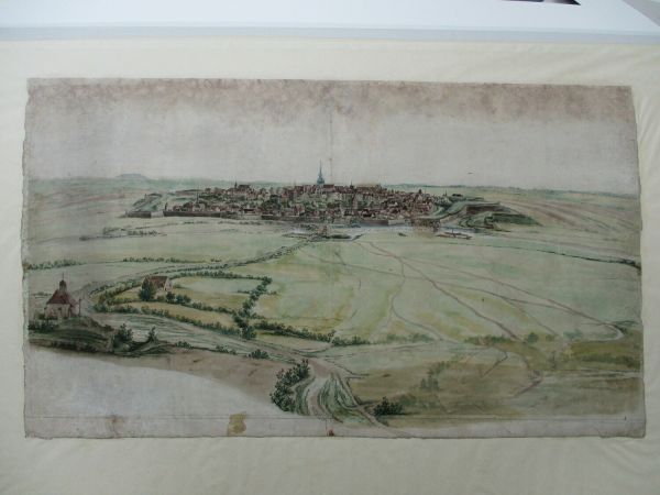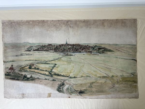 L'exécution raide, parfois même maladroite, la minutie avec laquelle est rendu le feuillage, nous incitent à voir une œuvre d'atelier. Les rehauts d'aquarelle, aux tons soutenus et posés en aplats, ne rappellent en rien, par ailleurs, la technique souple et vibrante de Van der Meulen. Ce paysage se retrouve dans la peinture de J.B. Martin, Prise de Gray (Versailles, MV 128) et dans l'estampe exécutée par Boudewyns en 1685, Vue de Gray (B.N.Est, Aa 10g) qui est, notons-le, sans rapport avec la composition peinte.