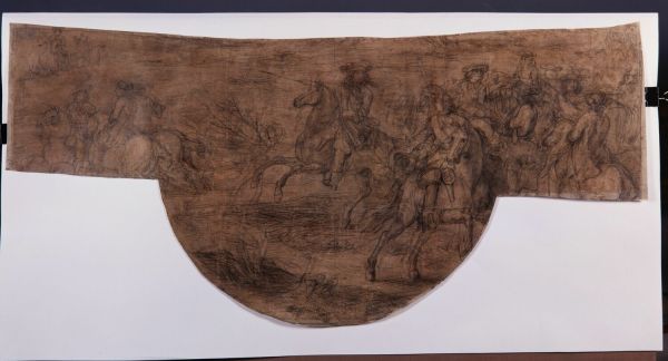 Après la prise d'Ypres le 25 mars 1678, Louis XIV regagna la France laissant ses troupes en Flandre. La ville de Leau (Leewe), siluée entre Liège et Louvain dans le Brabant, se rendit, le 4 mai au soir, à la suite de la prise de la citadelle le même jour, qui fut dirigée par le comte de Calvo en présence de M. de la Bretèche. Lors du traité de Nimègue du 17 septembre 1678, Louis XIV dut remettre la place de Leau à l'Espagne (Marquis de Quincy, 1726, I, pp. 588, 643). Van der Meulen ne la mentionne pas parmi les places qu'il dessina lors du huitième voyage entrepris en Flandre en 1679 (cf. cat. 132); pourtant il s'y rendit vraisemblablement comme l'atteste une feuille conservée au Louvre et représentant Trois croquis de Leewe qu'il prit sur le vif (Cabinet des Dessins, Inv. RF 4917 - Lugt, 1949, I, n° 822). Le dessin du Mobilier national a vraisemblablement servi de carton pour la Prise de Leewe classée, dans l'inventaire Paillet de 1695 (A.N. O1 1966 3 ), à Van der Meulen. Le tableau destiné à la décoration des dessus de cheminées de Marly (cf. Les Comptes des Bâtiments du Roi - Guiffrey, 1891, t. III, col. 90) est à nouveau signalé par Bailly en 1709-1710 sous le nom du maître (A.N. O1 1978 B ). Sans raison particulière, il est actuellement attribué à J.B. Martin (Versailles, MV 132 - Constans, 1980, n° 3152). Ce dernier exécuta néanmoins pour le château de Meudon une réplique d'un format cintré, dont on trouve la mention dans l'inventaire Paillet déjà cité (A.N. O1 1966 2 ). Le tableau, à notre avis, peut être identifié à la seconde Prise de Leewe de Versailles (MV 2039 - Constans, 1980, n° 3165). Le traitement simplifié mais ferme de cette vue, proche de plusieurs autres compositions à la sanguine pour lesquelles nous avions émis quelques réserves (cf. cat. 136, 140, 145), semble toutefois correspondre avec plus d'évidence au style du maître. Le rendu, notamment du feuillage au premier plan, se retrouve dans des œuvres sûres de l'artiste comme la très belle étude pour la Prise de Lille (cat. Starky 22).