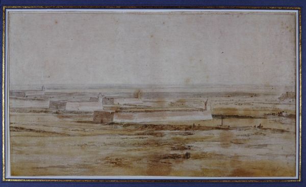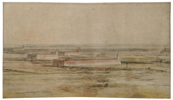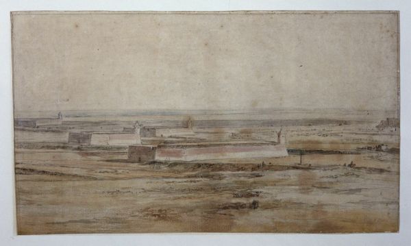 Cette étude, mise en rapport avec la Vue d'Arras (cat. 8) dans les précédents inventaires, en raison sans doute de l'annotation qu'elle porte, n'est pas sans rappeler en effet le motif de la demi-lune figurant au premier plan du dessin cité ci-dessus. Toutefois, il n'est pas à exclure la possibilité qu'il s'agisse d'une étude de fortification d'une autre ville du Nord. Ce dessin, caractéristique du style de Van der Meulen, a été restauré.