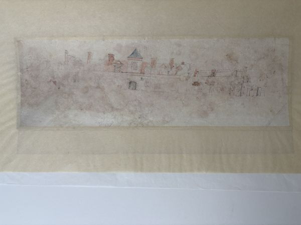 Les deux croquis 150 ont été dessinés sur nature par Van der Meulen. Ils sont à rapprocher de la Vue d'un quartier d’une ville (cat. Starky 187) qui présente une facture semblable à celle des études de Fontainebleau exécutées sans doute en 1664, c'est- à-dire au début de la carrière de l'artiste à la Manufacture des Gobelins. Suivant Vincent Droguet (courrier, 1997), les dessins recto et verso figurent le bâtiment de la Héronnière qui se trouvait dans le parc. Au recto se voit la cour avec son corps de logis au fond et les grandes arcades sur les côtés que Madame Jestaz identifie comme des cages. Le verso représente l’avant-cour de ce même bâtiment avec des détails aussi précis que le F de François Ier sur les souches de cheminée (comparer avec le tableau de Fontainebleau par Martin).