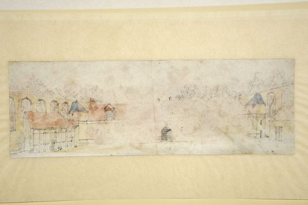 Intérieur de cour avec des bâtiments et deux aqueducs [identifié comme Fontainebleau]