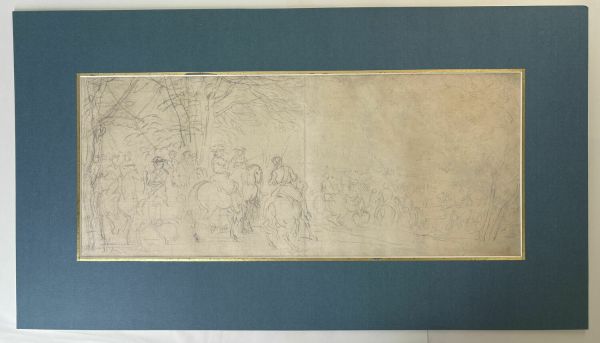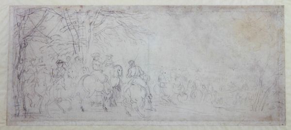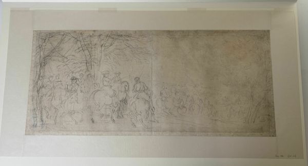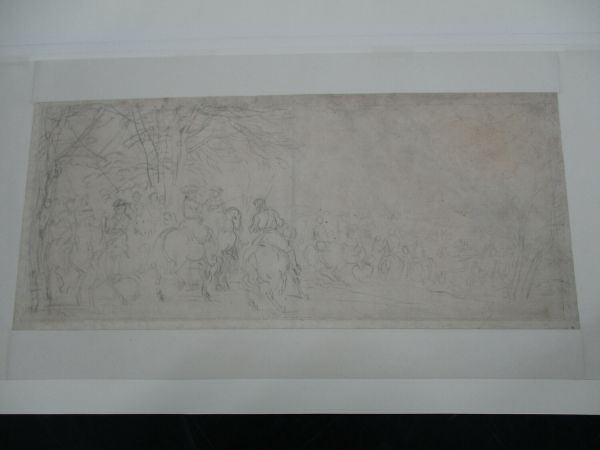Au premier plan parmi des cavaliers apparaît le roi. Il tend son bâton de commandement en direction du fleuve traversé par d'autres cavaliers. Le groupe du premier plan se retrouve avec des variantes, à droite et non plus à gauche, dans le tableau de Caen, le Passage du Rhin dirigé parle roi (Musée des Beaux-Arts - Menegoz, 1928, n° 79), esquisse de la partie centrale de la composition projetée par Van der Meulen pour célébrer cet épisode glorieux (cf. cat. 51). Ici, contrairement à l'étude précédente (cat. Starky 51), l'artiste s'intéresse à la mise en page du groupe et n’ébauche qu'à peine le paysage. L'exécution à la pierre noire est souple et spontanée ; de petits traits nerveux comme des virgules indiquent le modelé des chevaux. Ce traitement esquissé et large se retrouve dans l'Etude du canal de Bruges (cat. Starky 30), autre composition dans laquelle Van der Meulen s'attache avant tout à mettre en place les figures. Des affinités stylistiques peuvent également être relevées avec une feuille du Cabinet des Dessins du Louvre, Louis XIV entouré de cavaliers, classée à Le Brun mais qu'il serait plus juste d'attribuer à Van der Meulen (Inv. 29763 - Guiffrey, Marcel, 1913, VIII, n°6340 repr. - Comm. or. de Lydia Beauvais qui prépare une thèse à l'École du Louvre sur les dessins de Le Brun du Cabinet des Dessins du Louvre).