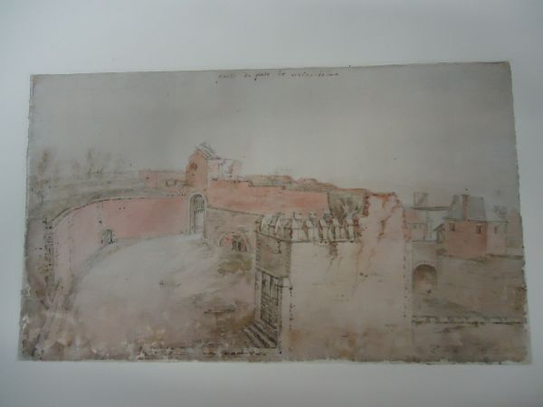 En mauvais état, malgré la récente restauration, le dessin appartient à ce même ensemble d'études de détail prises sur le motif par un aide de Van der Meulen (cf. cat. 102-103) après la conquête de Valenciennes. Malgré une évidente maladresse dans la traduction de l'architecture, que l'on retrouve — notons-le — dans la Vue d'une partie de Valenciennes (cat. 101), la facture est évidemment de la même main. L'identification du dessin précisée par une annotation de Van der Meulen indique qu'il s'agit du réduit de Valenciennes : « c'est à dire un lieu situé avantageusement et séparé du corps de la place pour s'y retirer en cas de surprise... il consiste principalement en un pâté qui est un fort grand ouvrage sous lequel il y a une grosse porte avec un pont-levis pour la communication d'un quartier du réduit à l'autre. » (Eeckman, 1895, p. 382).