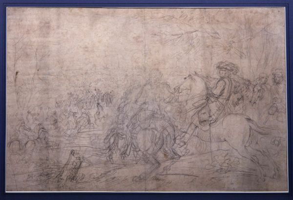 Venant de la droite, Louis XIV à cheval est suivi par deux cavaliers, le prince de Condé et le marquis de Créqui ; à sa gauche, au centre, est esquissé un autre cavalier qui pourrait être le marquis de Bellefonds (cf. Meyer, 1980, p. 101). A l'arrière-plan, l'armée traverse le canal pour attaquer les Espagnols. Le combat près du canal de Bruges le 31 août 1667 marqua la fin de la campagne de Flandre. Le comte de Marsin, à la tête des troupes espagnoles, accompagné du prince de Ligne avançait pour secourir Lille ignorant la reddition de la ville. Louis XIV envoya alors au devant d'eux les marquis de Créqui et de Bellefonds afin de les empêcher de se retirer au moment où ils apprendraient la prise de la ville (Marquis de Quincy, 1726, I, p. 284). Van der Meulen n'assista pas au combat près du canal de Bruges qui n'est, d'ailleurs, pas mentionné dans son Mémoire. Sans doute est-ce à partir de témoignages qu'il recomposa la scène destinée à être célébrée dans la tenture de l 'Histoire du Roi. M. Jean-Marie Moulin (1960) a proposé devoir dans la conception du Canal de Bruges une œuvre personnelle de Van der Meulen contrairement aux autres événements de la campagne de Flandres, figurant dans cette même tenture, et dus à la collaboration de Le Brun et de Van der Meulen. Le dessin du Mobilier national, de grandes dimensions, est caractéristique du traitement esquissé et nerveux de l'artiste flamand que l'on retrouve dans d'autres compositions; citons par exemple la très belle sanguine de Louis XIV au prieuré de Fives (cat. 22) ou l'étude pour la Prise de Dole (cat. Starky 32). À la suite de celle composition fut exécutée une élude très achevée, conservée au Louvre et classée sous le nom de Van der Meulen (Cabinet des Dessins, Inv. 20059 - Lugt, 1949, 1, n° 788). Signalons que l'École des Beaux-Arts de Paris conserve une réplique de cette dernière composition, attribuée au maître, mais due, à notre avis, à une autre main.