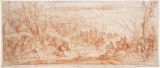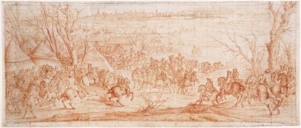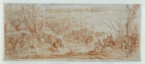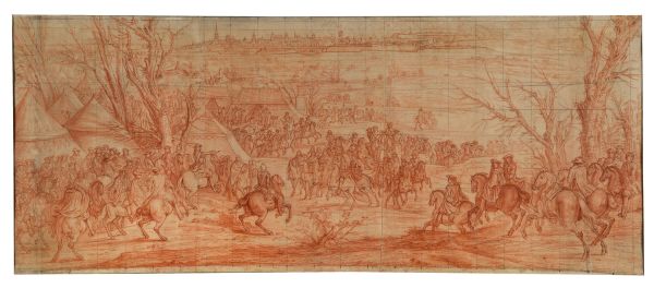 Devant la ville de Cambrai, vue du côté sud-ouest, est installé le camp royal. Sur la gauche, Louis XIV à cheval, entouré de son état-major, dirige son bâton de commandement vers la place forte. Parmi les tableaux de la première série des Conquêtes du Roi exécutés par Van der Meulen pour Marly, figure un Siège de Cambrai par Louis XIV (Louvre, Inv. 20293 - Dépôt au Musée municipal de Cambrai) avec lequel ce dessin est relation. Mentionné ainsi par l'artiste dans son Mémoire (p. 130), Le Roy devant Cambray avec sa cour, le sujet de la composition peinte est clairement présenté par R. Bonnart dans la gravure qu'il réalisa d'après Van der Meulen en 1686 : « Le Roy s'estant rendu maître de la ville de Cambray attaque ensuite et prend la citadelle jusqu'alors imprenable en l'année 1677 » (B.N.Est, Aa 10g). Cette étude, par ses dimensions réduites, peut être rapprochée de répliques citées dans l'Inventaire Van der Meulen. Signalons par exemple le n°48 : « Une coppie de Cambray, par Everts » (4 pi. 5 po., 3 pi. 6 po.) (p. 136) dont le format dans sa longueur est proche du dessin étudié. Celui-ci offre un traitement linéaire qui est destiné avant tout à mettre en valeur le contour des formes. Mais l'évidente sécheresse du trait et la traduction presque naïve des visages à la fois ronds et épais ne correspondent pas au style du maître. Le rapprochement avec une autre étude très achevée, dont l'attribution à Van der Meulen ne peut être contestée — il s'agit de Louis XIV au prieuré de Fives (cat. Starky 22) — révèle le manque de vigueur de la facture du dessin étudié que nous proposons donc d’attribuer à l'atelier. D'autres compositions à la sanguine, conservées au Mobilier national, sont très certainement de la même main ; citons l’Etude pour le Siège de Valenciennes (cat. Starky 109) ou celle de Leau (cat. Starky 157). Une autre version du Louis XIV devant Cambrai, classée sous le nom de Van der Meulen, est conservée au Cabinet des Dessins du Metropolitan Museum de New York (Inv. 61.56- Hulst, 1961, p. 120, repr.). Le traitement semble plus achevé et plus fouillé, notamment dans le Feuillage. Dans le même sens que l'estampe de R. Bonnart, et de dimensions voisines, on peut supposer que la composition permit de tirer une contre-épreuve utilisée ensuite pour graver la planche ; ou peut-être le dessin de New York, Fut-il simplement exécuté d'après l'estampe ? Signalons enfin une grande Feuille d'étude pour le cavalier vu de dos au centre (Windsor Castle, n° 12987). Tracé à la sanguine en sens inverse, le dessin, dont l'attribution à Van der Meulen ne semble pouvoir être acceptée, était sans doute destinée à être reporté.