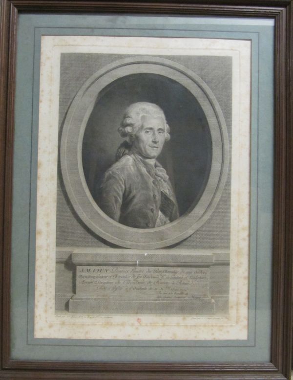 Dans un cadre ovale sculpté se détache le buste de Vien - "J.M. VIEN - Premier Peintre du Roi, chevalier de son ordre, Directeur, Recteur et Chancelier de son Académie Rle de peinture et sculpture - Ancien Directeur de l'Académie de France à Rome. Dédié et présenté à l'académie le 31 xbre1790 par son très humble et très dévoué serviteur Miger".