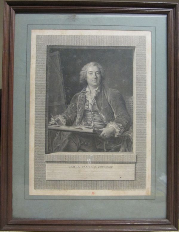 Dans un cadre ovaler se détache le buste de Carle Van Loo assis sur un fauteuil en train de dessiner - "CARLE VAN LOO CHEVALIER"