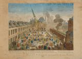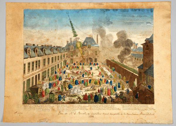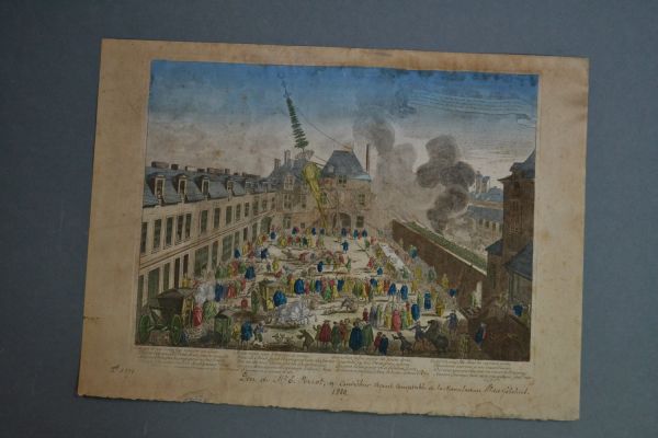 Gravure rehaussée de quatre couleurs : rouge, jaune, bleu, vert sur les batiments , personnages et le mai, quelques chevaux restés sans rehaut.