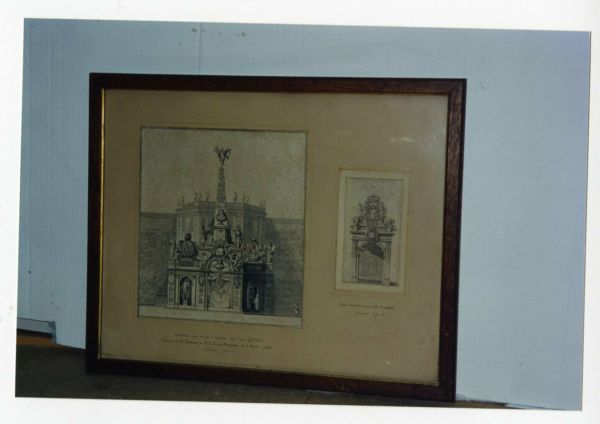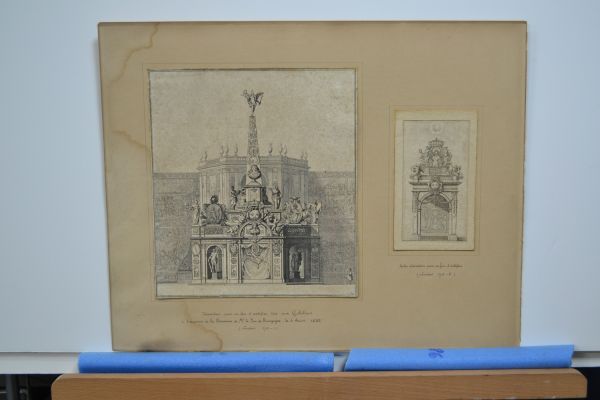 Sous verre 2 gravures collées sur cache - carton beige - Taches d'humidité.